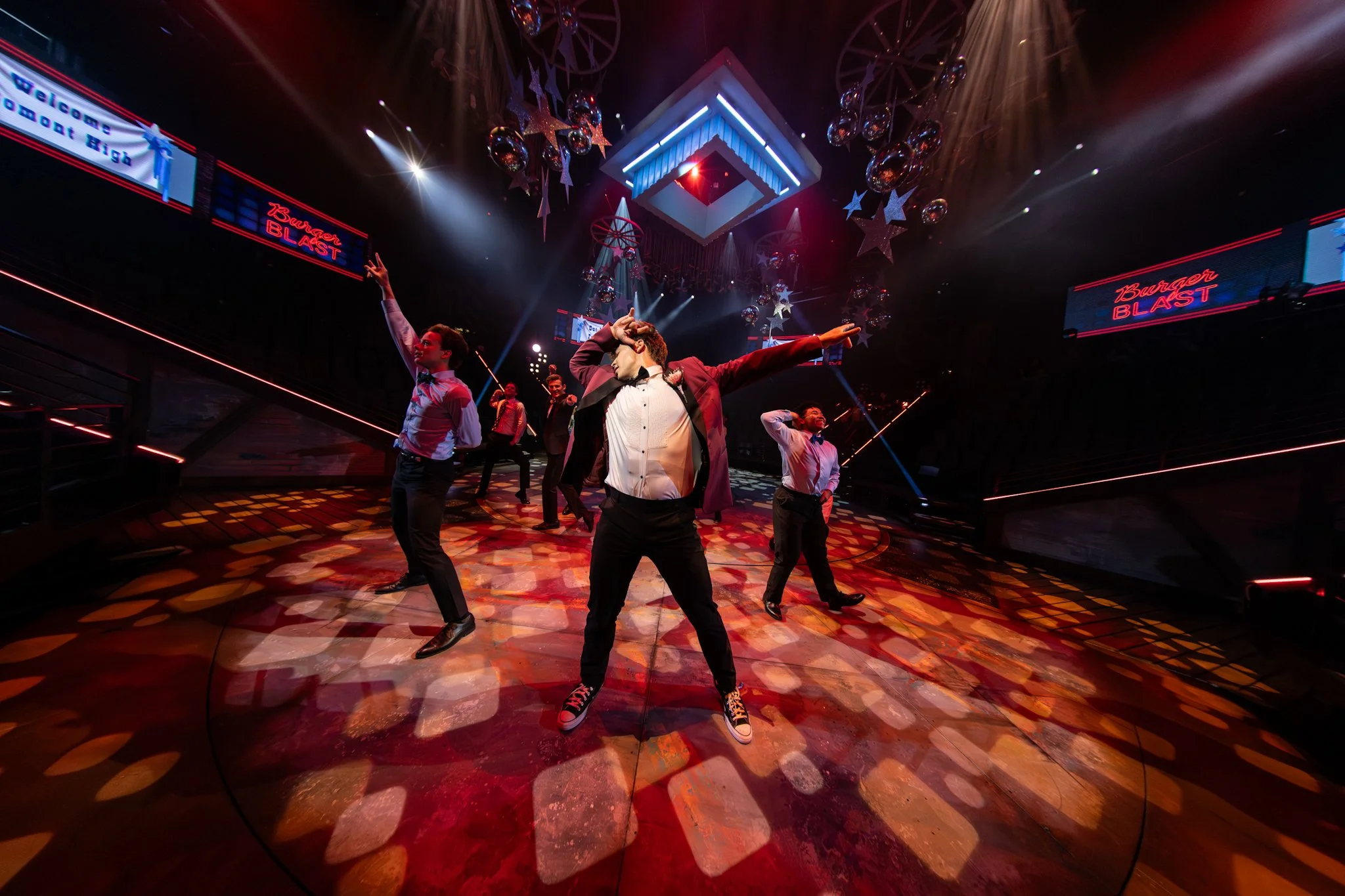 The Burger Blast neon signage, the gym bleachers, the hand-painted bridge railings—every scenic element was designed to reflect light, and our job was to make them feel alive.