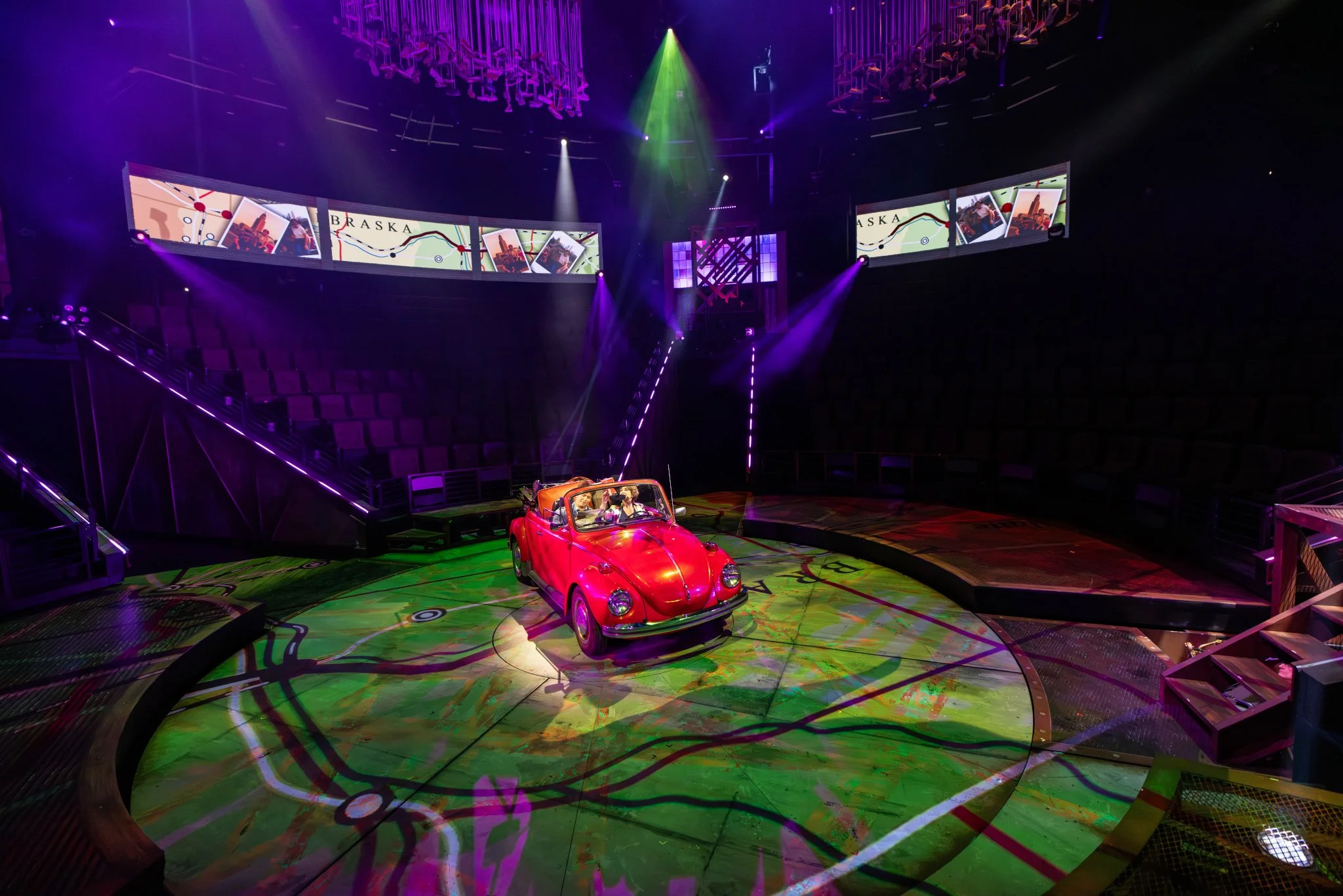 FX included haze and fog systems, sparkulars, confetti cannons, neon pixel bars, and flying scenic units