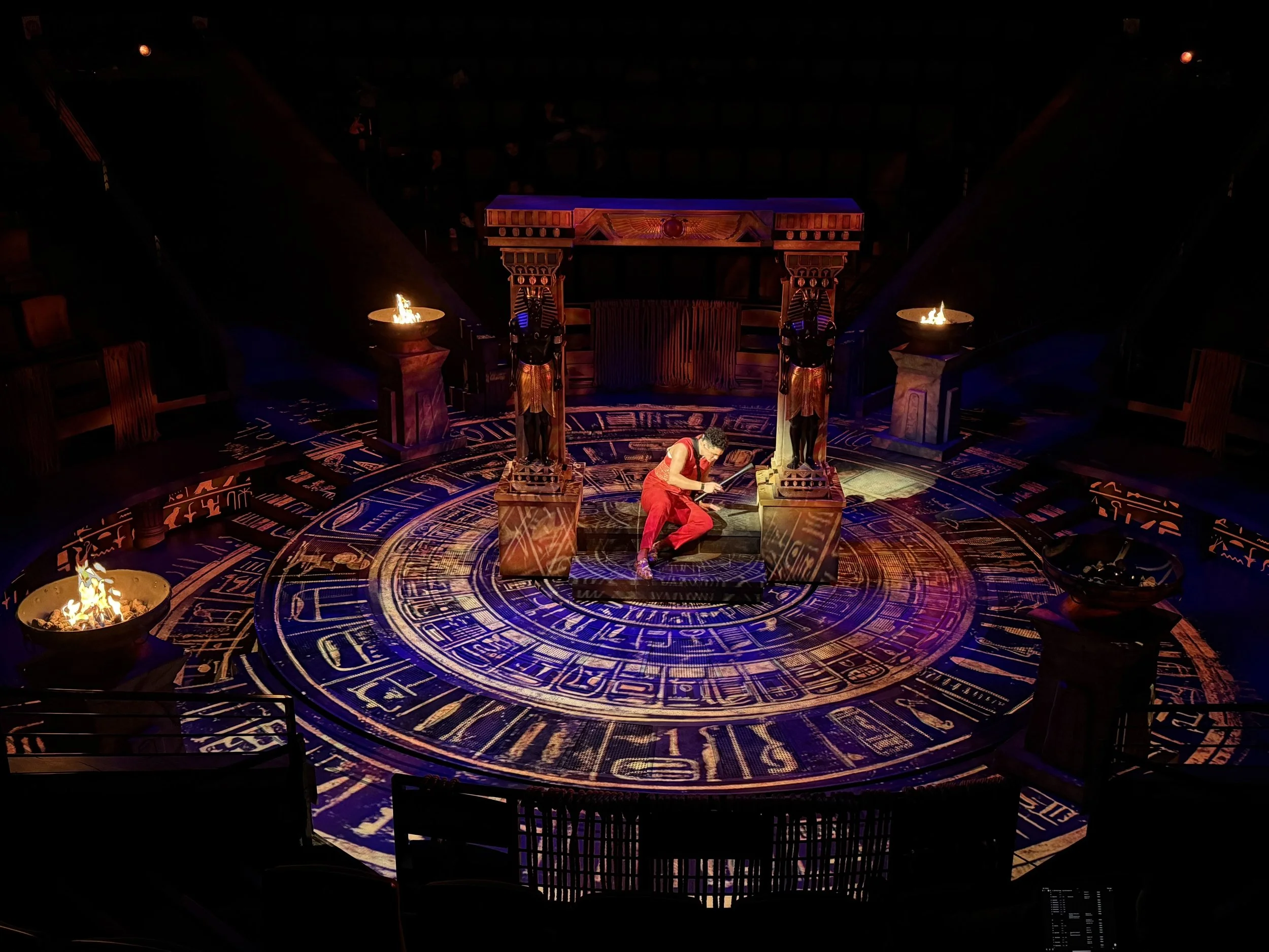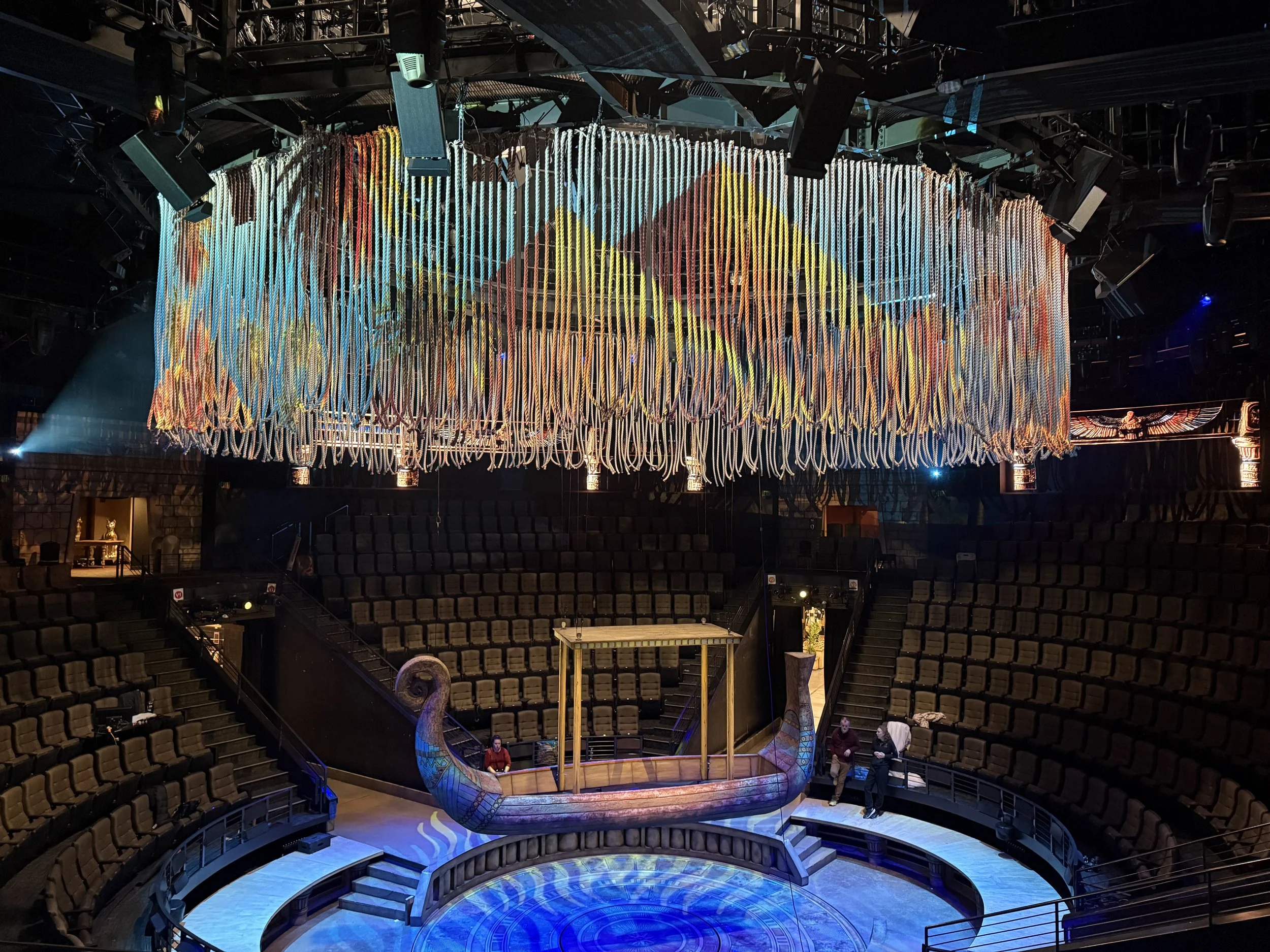 Beyond the rope and the deck, we wrapped the upper ring of the theater with scenic carvings that doubled as subtle projection surfaces. These 360° screens gave us even more room to extend the visual world—echoing motifs, introducing movement, and surrounding the audience with light and content. When these surfaces lit up, it felt like Egypt was breathing over your shoulder.