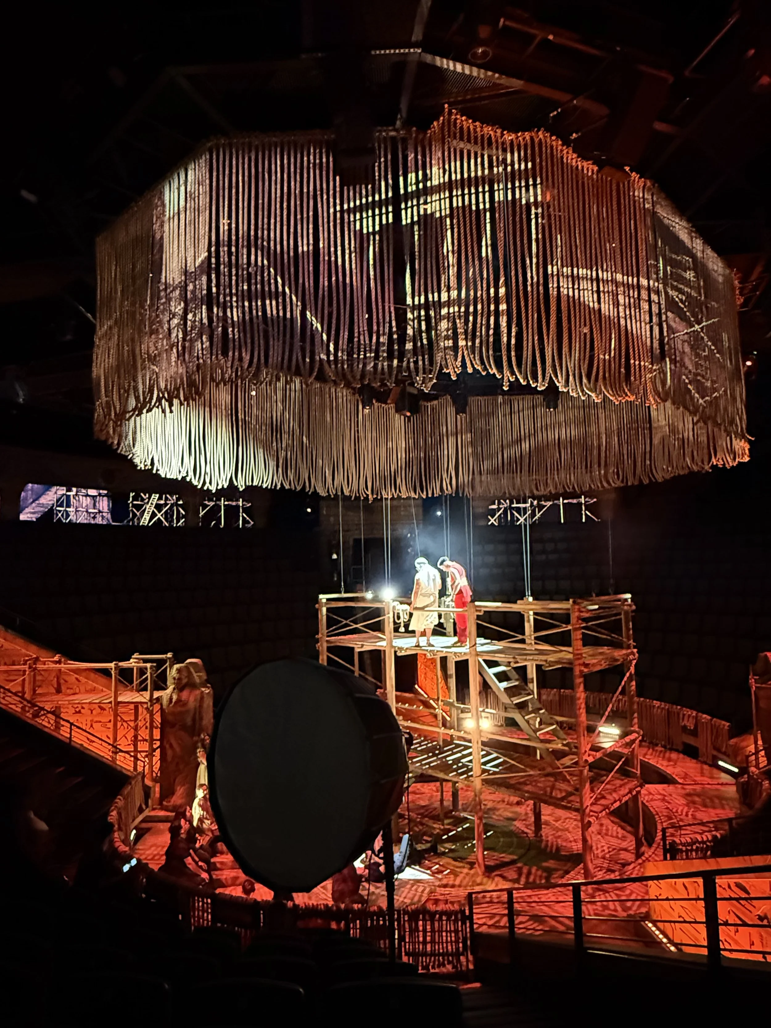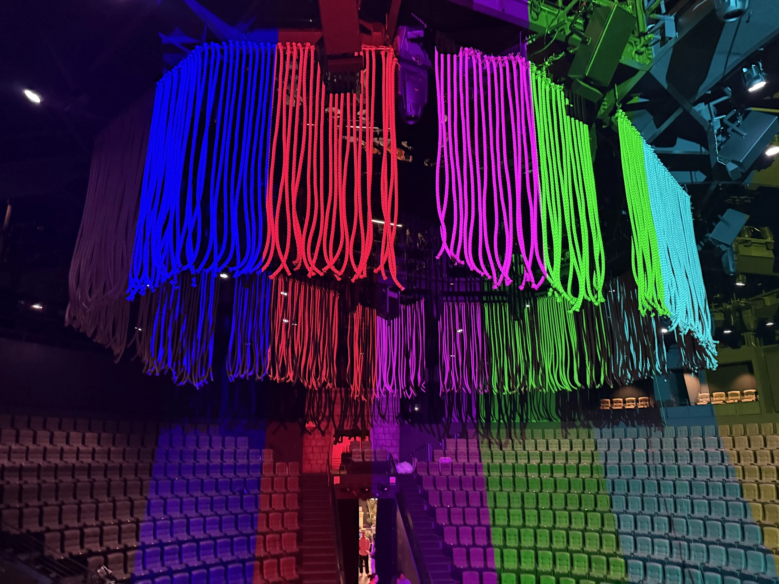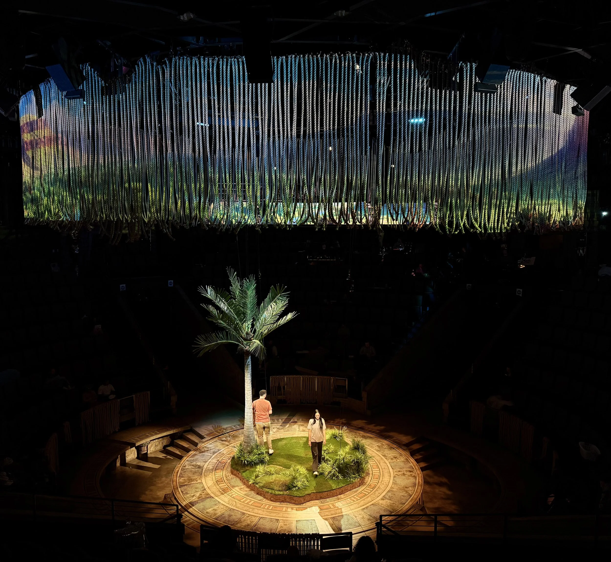 One of the boldest choices we made was suspending a full circular "rope ring" above the stage—hundreds of thick ropes forming a tactile, 360-degree projection surface. Collaborating with scenic designer Nate Bertone and the incredible Hale Centre Theatre design and production teams, we designed the rope ring as both scenic architecture and projection canvas.