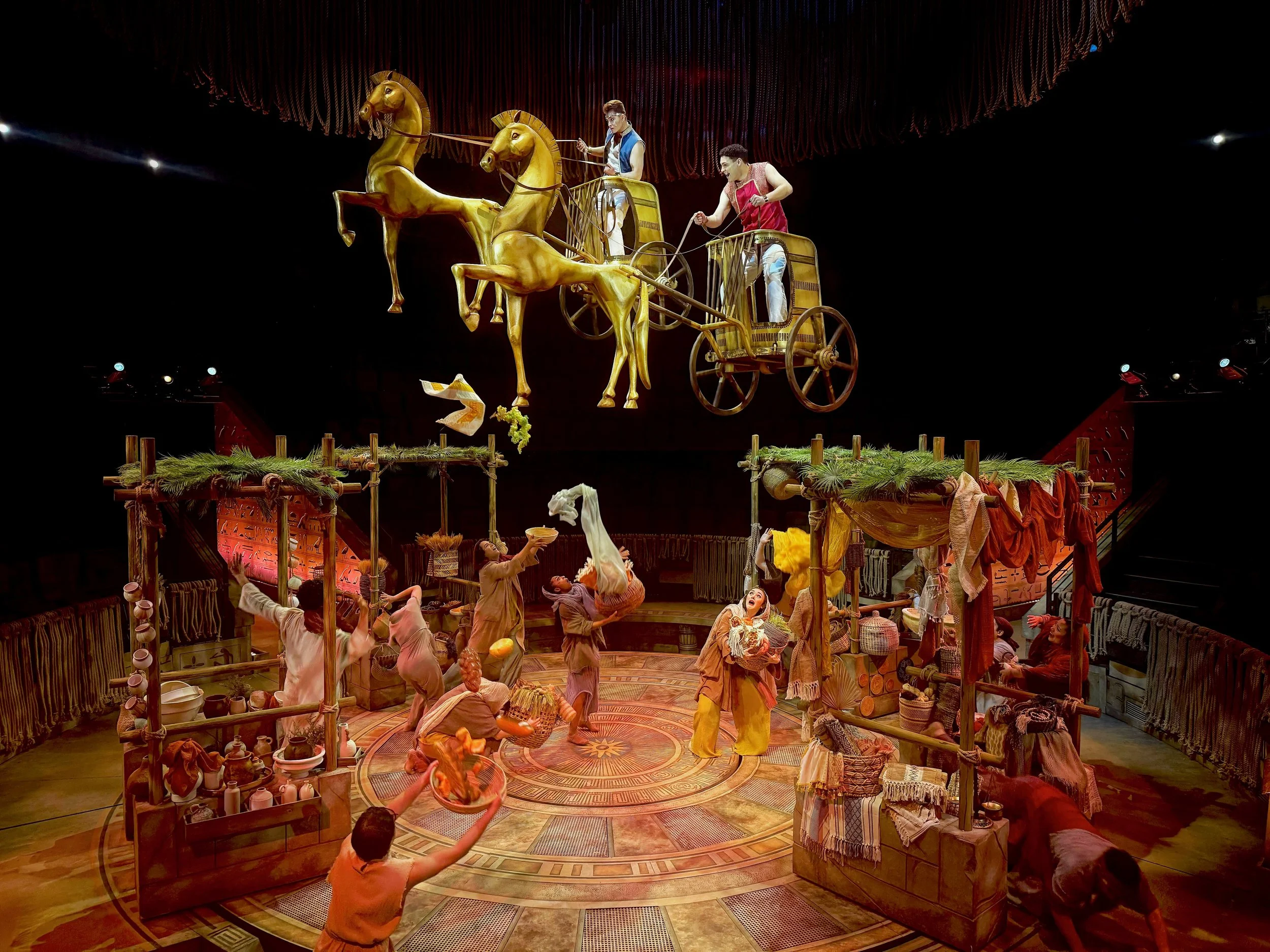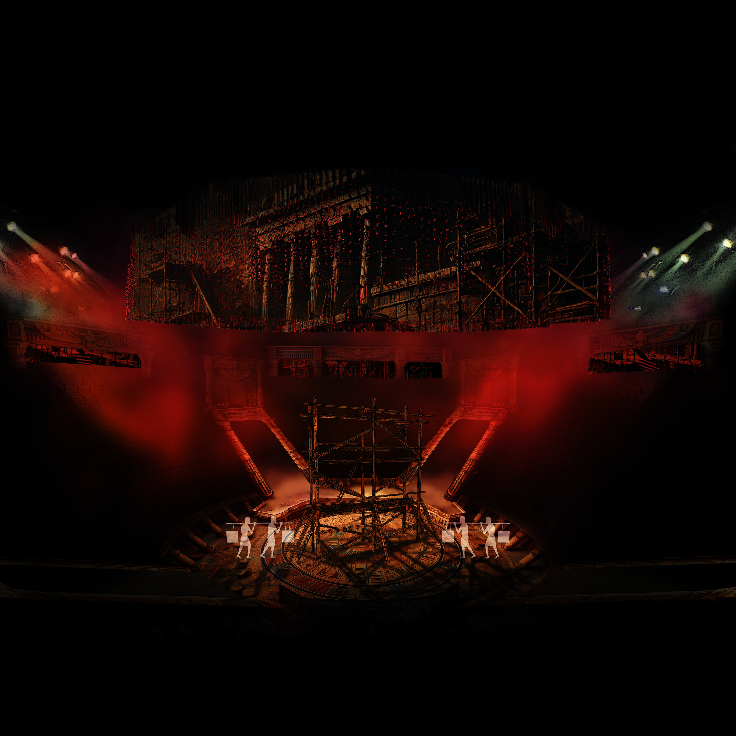The foundation for the visual language of The Prince of Egypt began with director Dave Tinney’s powerful concept: a show that honored the sacred nature of the story while embracing the scope and theatricality required to tell it in-the-round. Dave’s vision drew from religious texts, interpretive movement, epic cinematic motifs, and a balance of allegory and reverence.