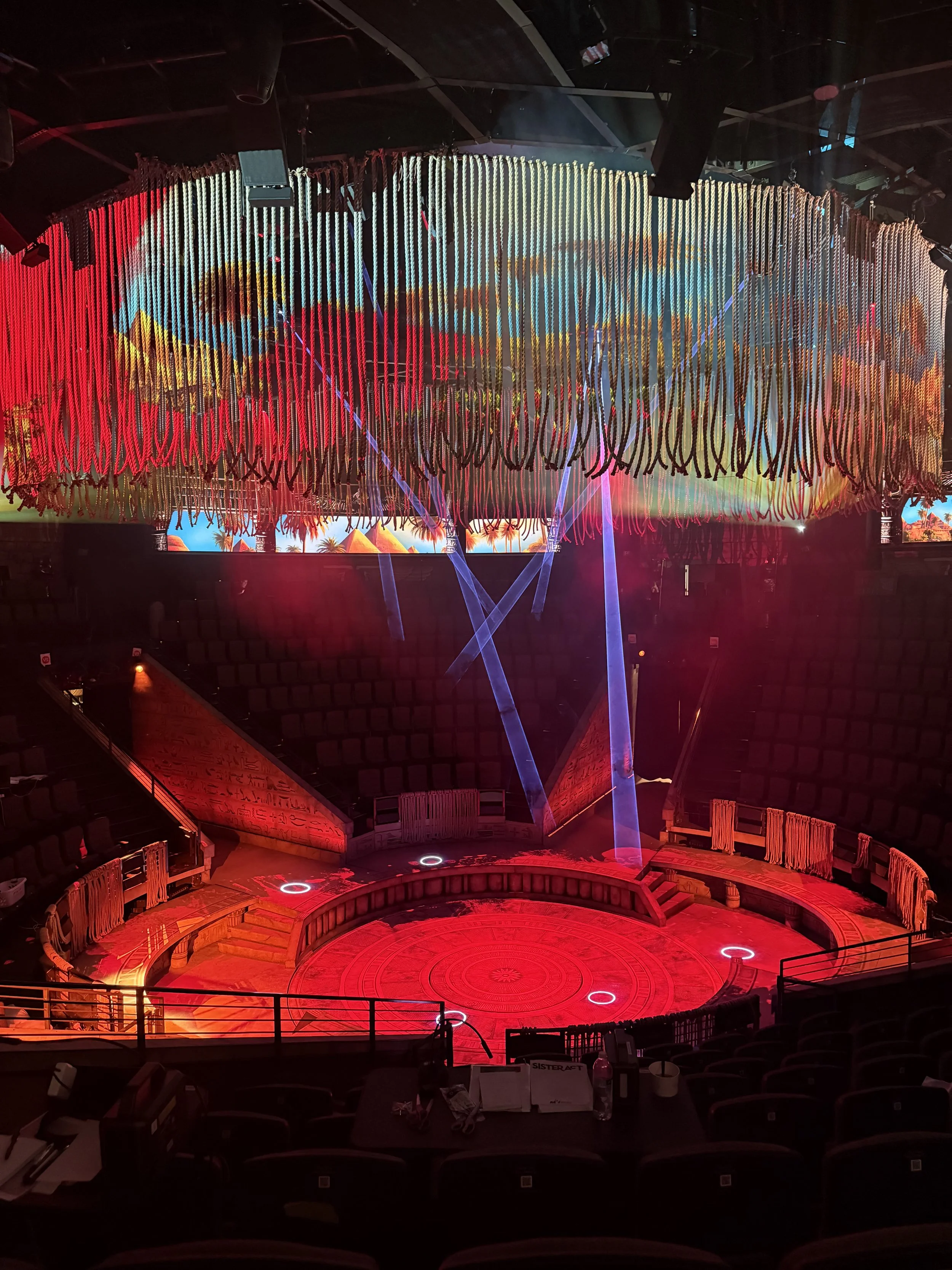 Throughout the show, projection established scope and setting—temples rising across the rope ring, sand swirling beneath characters’ feet—while lighting carved out emotion, rhythm, and tone. Sometimes the content took the lead. Other times, the light told the audience where to look and what to feel. But in every case, they worked together to serve the story.